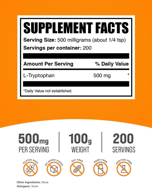 BulkSupplements.com L-Tryptophan Powder - 500mg Amino Acid Supplement, Gluten Free - 100g (3.5 oz) Pack of 1
