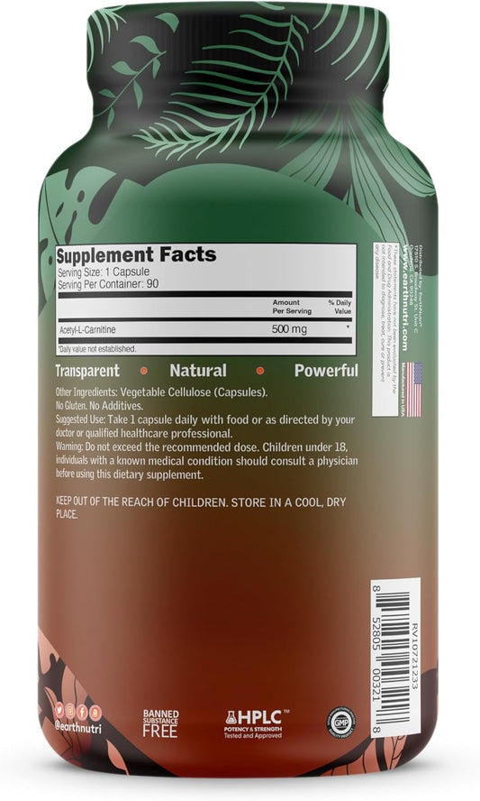 EarthNutri Acetyl-L-Carnitine Capsules - 90 Count, Additive-Free & Non-GMO