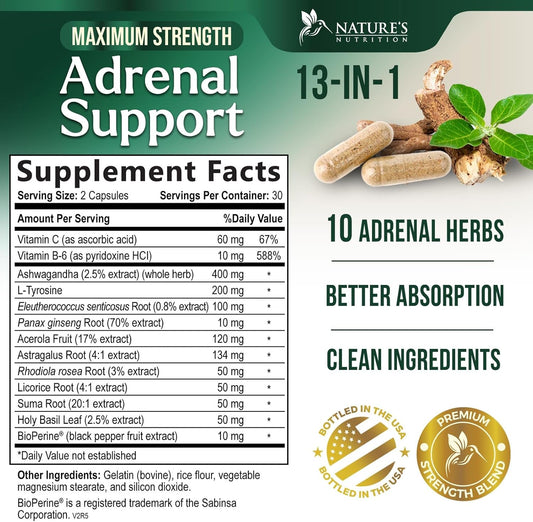 Ashwagandha & 10 Adaptogenic Herbs Adrenal Support Supplement - Rhodiola Rosea, Holy Basil - Energy Balance, Stress Relief - 60 CapsulesVendor:Nature's NutritionRegular price $98.82 AUDRegular priceUnit price / per-