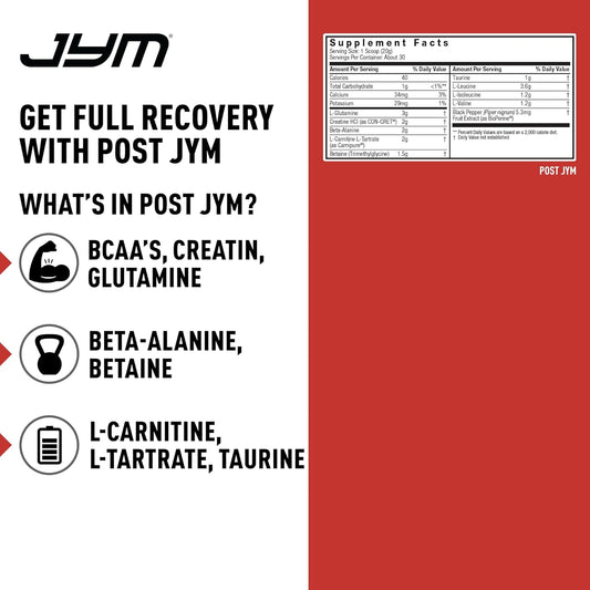JYM Post-Workout Supplement with BCAA's, Glutamine, Creatine HCL, Beta-Alanine - Natural Lemon Lime Flavor - 30 Servings