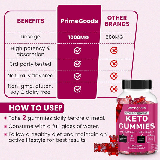 Keto Apple Cider Vinegar Gummies for Weight Loss & Energy Boost with Vitamin B6, B12, Pomegranate, and Beet Root - PrimeGoods