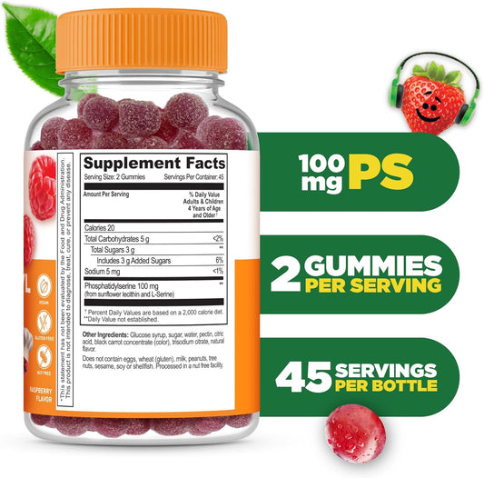 Kids Phosphatidylserine (PS100) Gummies - 100mg Focus Supplement - Great Tasting - 90 Count