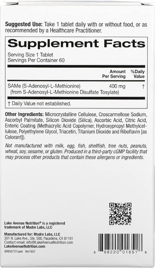 Lake Avenue Nutrition Same Disulfate Tosylate 400mg 60 Enteric Coated Tablets for Improved Mental Health and Cognitive Function