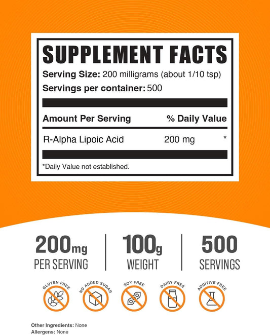 BulkSupplements.com R-Alpha Lipoic Acid Powder - 200mg per Serving - Antioxidant Supplement - Gluten Free - 100g (3.5 oz) Pack