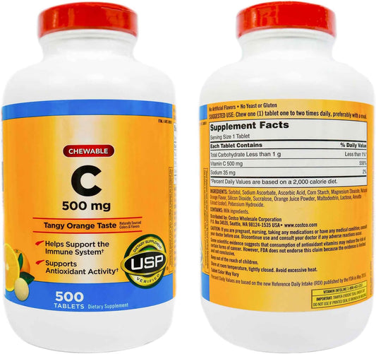 2 Packs of Blue Ribbon Chewable Vitamin C 500 mg Tablets - Tangy Orange Flavor, 1000 Tablets Total