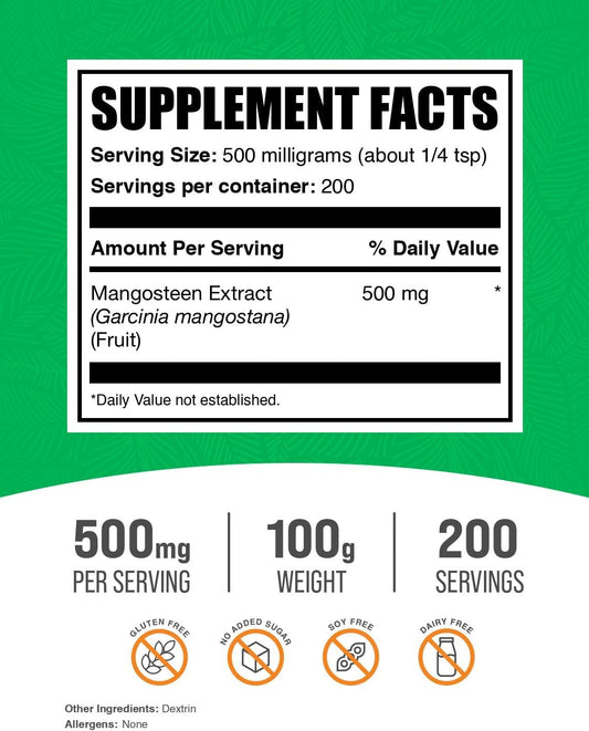 BulkSupplements.com Mangosteen Extract Powder - Superfood Supplement, Pure Mangosteen Fruit Powder - 500mg per Serving, 100g (3.5 oz) - Gluten Free - 1 Pack