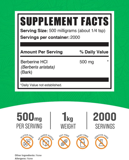 Berberine HCl Powder - 500mg Berberine Supplement, Gluten Free - 1kg (2.2 lbs) Pack of 1