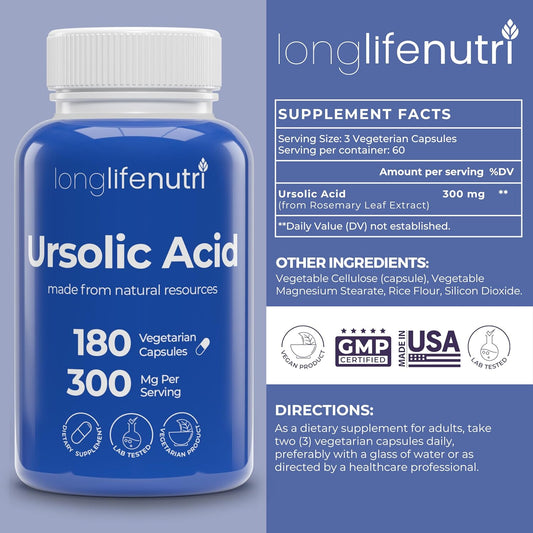 Organic LongLifeNutri Ursolic Acid 300mg Capsules - Rosemary Leaf Extract, 180 Vegetarian Caps, Muscle Growth & Recovery Supplement, 2-Month Supply, Lab Tested, GMP Certified, USA Made