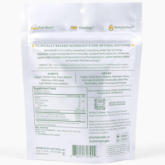 Plant People WonderBurn Gummies for Metabolism & Cravings Control - Zero Sugar, Ripe Mango Flavor (60 Count)
