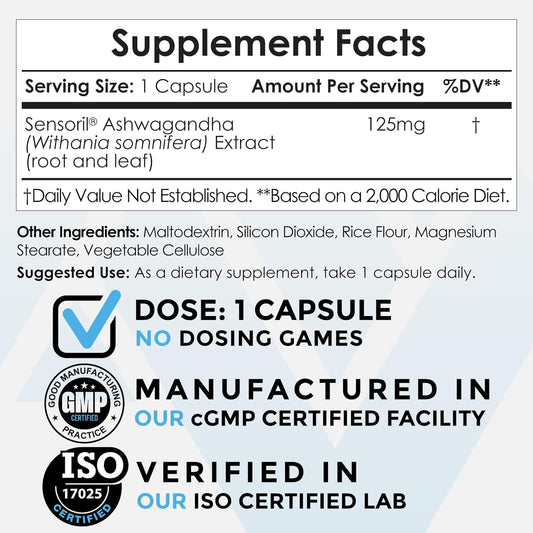 180 Ct. Sensoril Ashwagandha Capsules | 125mg | Withania somnifera Extract | Energy & Cognition Support Supplement