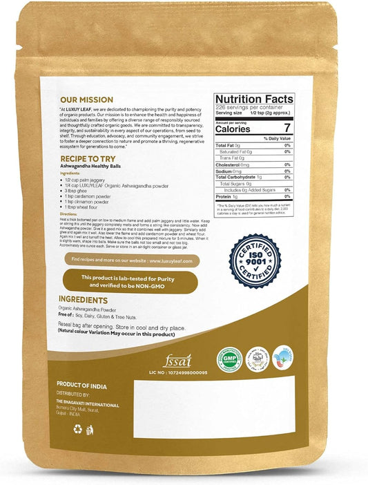 Organic Ashwagandha Root Powder - Non-GMO, Vegan-Friendly LuxuryLeaf for Health & Wellness