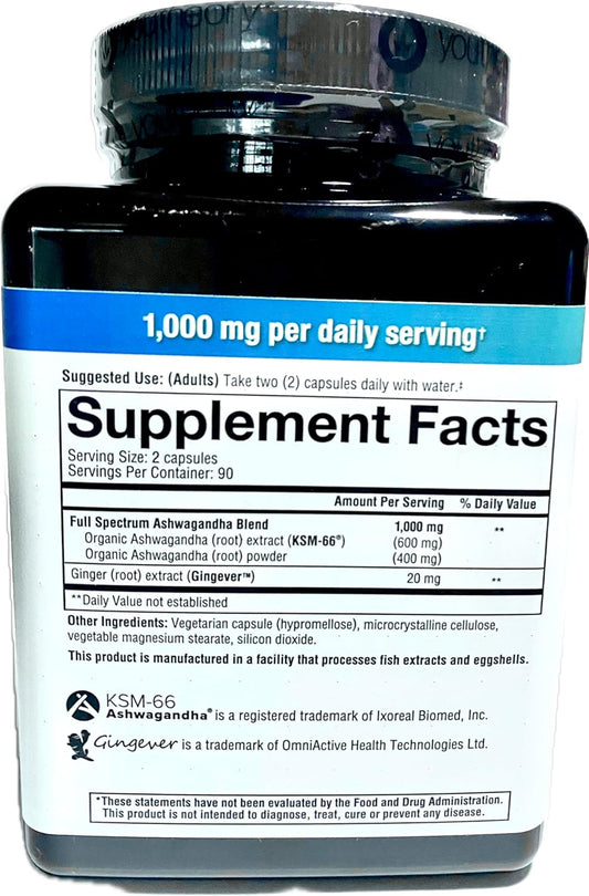 Organic KSM-66 Ashwagandha Supplement for Stress Management - 180 Capsules, 1000mg - Vegetarian Formula