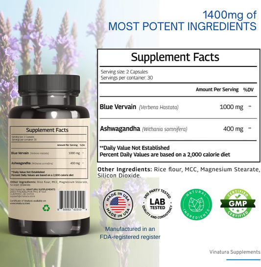 Premium Blue Vervain & Ashwagandha Capsules - 1400mg per serving, Brain Health & Stress Relief Support, 60 Count