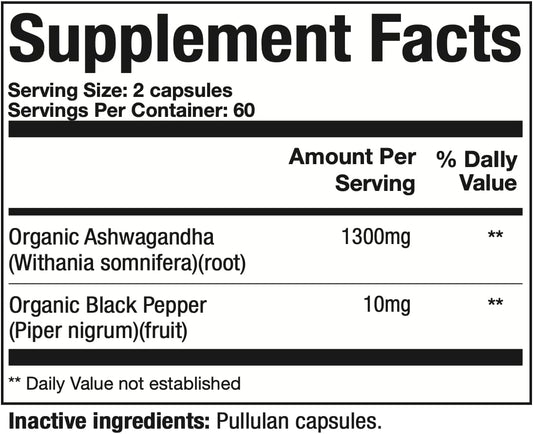 Organic ASHWAGANDHA Root Supplement 1300mg with Black Pepper - Natural Stress & Mood Support - 120 Capsules