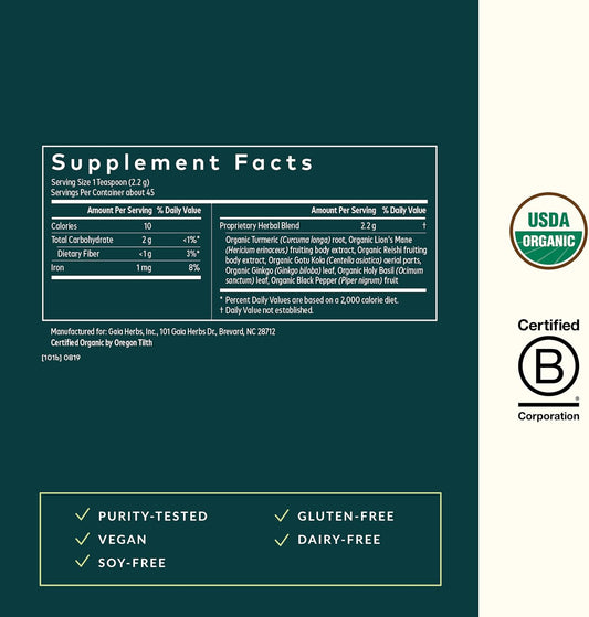 Organic Gaia Herbs Lion's Mane & Turmeric Powder - Brain Health Supplement - USDA Certified - 3.53 Oz - 45-Day Supply