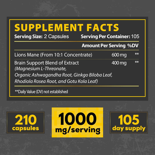 210 Vegan Capsules Lions Mane Supplement with Magnesium L-Threonate, Ashwagandha Root, Ginkgo Biloba, Rhodiola Rosea, and Gotu Kola for Brain Health, Mood & Energy.