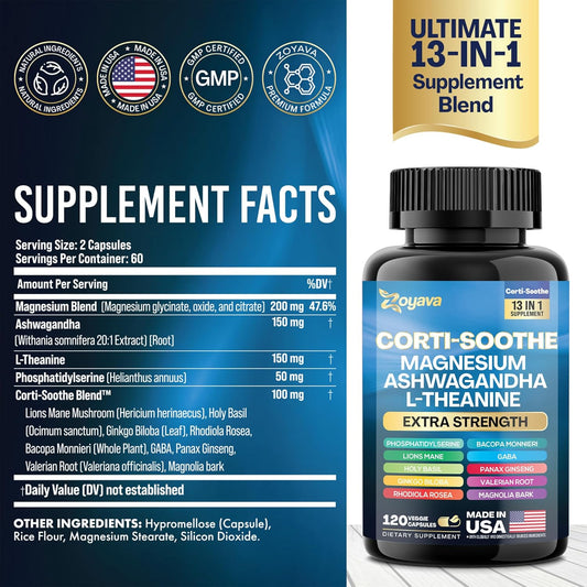Zoyava Stress Relief Supplement with Magnesium, L-Theanine, Ashwagandha, Phosphatidylserine, Lions Mane, and more (120 Caps)
