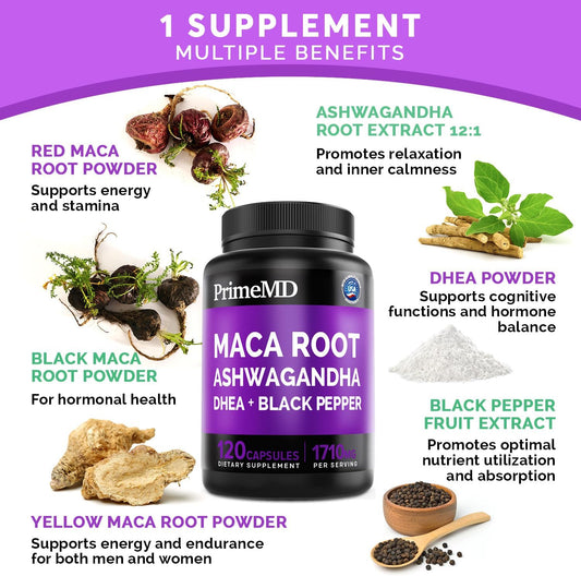 Organic Maca Root Ashwagandha Capsules with DHEA - Stamina and Mood Support Supplement for Women and Men - 120ct