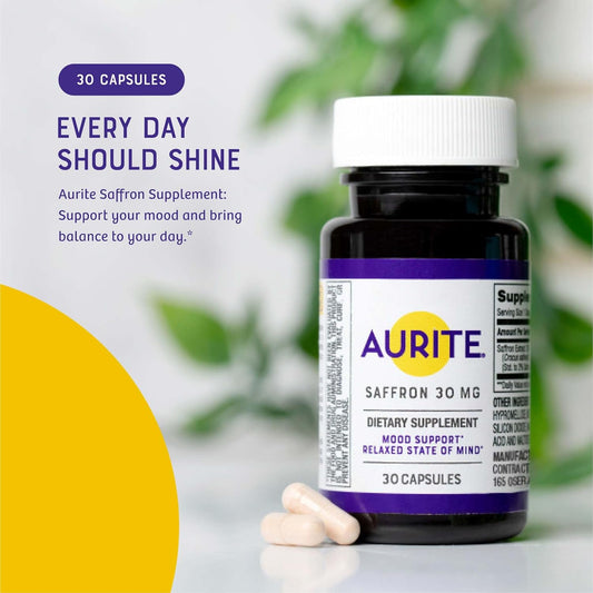Aurite Saffron Supplement for Stress Management & Mood Support - 60 Count, 30mg Saffron, Memory Support, Vegetarian, Non-GMO, Gluten & Soy-Free - 2 Month Supply for Women & Men