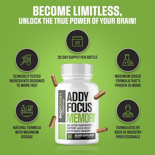 Ultra Strength Memory and Focus Supplement - Natural Adderall Substitute for Energy - Nootropic Pills with Science Backed Formula - 3rd Party Tested - 60 Capsules