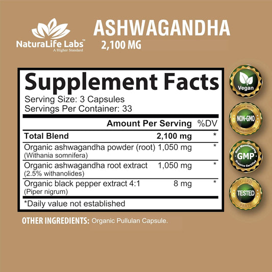 NaturaLife Labs Organic Ashwagandha 2,100 mg - 100 Veggie Capsules for Stress Relief and Mood Support