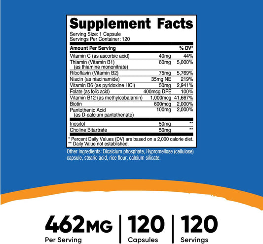 Nutricost High Potency Vitamin B Complex Capsules with Vitamin C for Energy Support - 120 Capsules