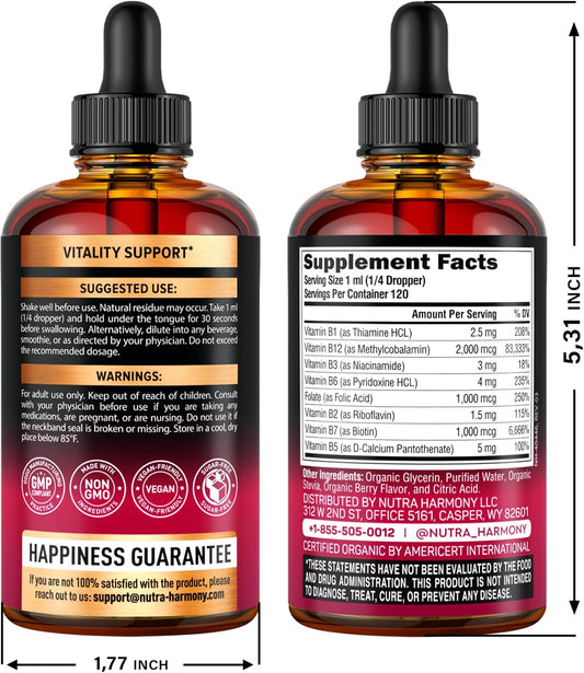 Organic B-Complex Liquid Drops with Pantothenic Acid, Methylcobalamin, Thiamine, Pyridoxine, Biotin, Folic, and Niacinamide - 4fl oz USA-Made Supplement