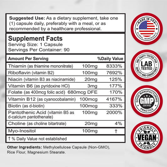 Premium Super B Complex Vitamins with B12, B1, B2, B3, B5, B6, B7, B9, Folic Acid - 90 Vegetarian Capsules - Energy Metabolism Support