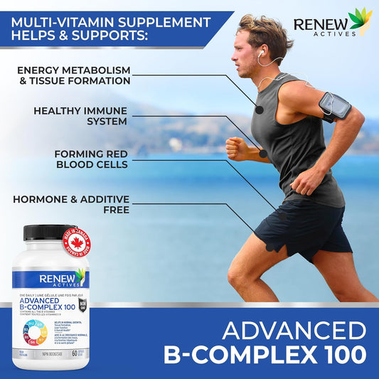 Renew Actives Vitamin B Complex 100 Capsules for Balanced Health & Energy - Daily B1, B2, B3, B5, B6, B12 Supplement with Liver Support & Red Blood Cell Formation - 60 Count