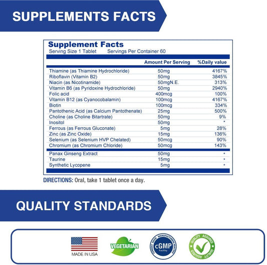 Men's Timed-Release B Complex Supplement - Boost Energy & Metabolism with 10 Vitamin Bs - Vegetarian Tablets (60 Count)