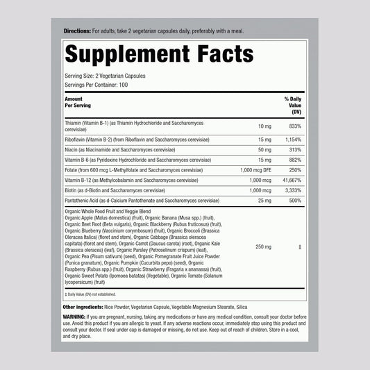 Vegetarian B Complex Supplement with Whole Food Fruits & Veggies - 200 Capsules with Vitamin B-12 - Non-GMO