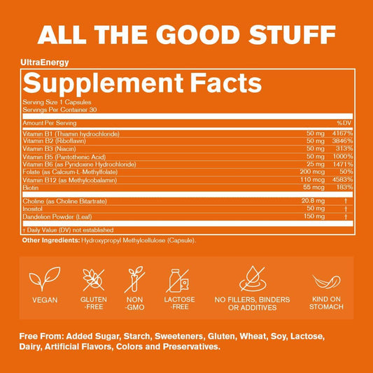 DR.VEGAN UltraEnergy B Vitamin Complex Capsules - Vegan Friendly, High Strength Formula with B12, Choline, Biotin, Folate - 30 Count