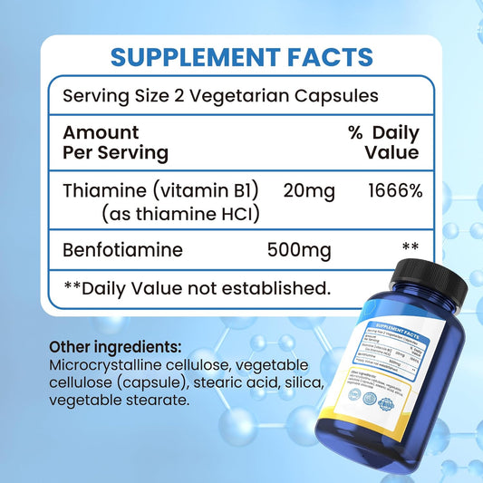 Non-GMO Vegan Benfotiamine Supplement with 500mg Vitamin B1 - 120 Capsules Gluten-Free