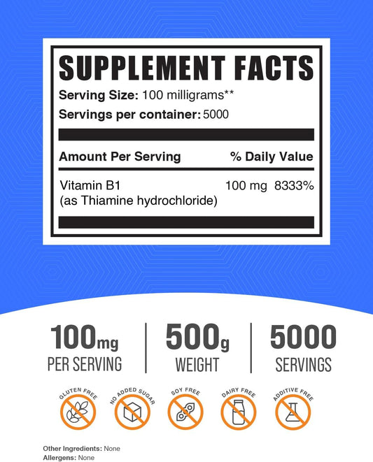 High-Quality Thiamine HCl Powder - B1 Vitamin Supplement, Gluten-Free, 100mg per Serving, 500g (1.1 lbs) - Bulk Size, Pack of 1