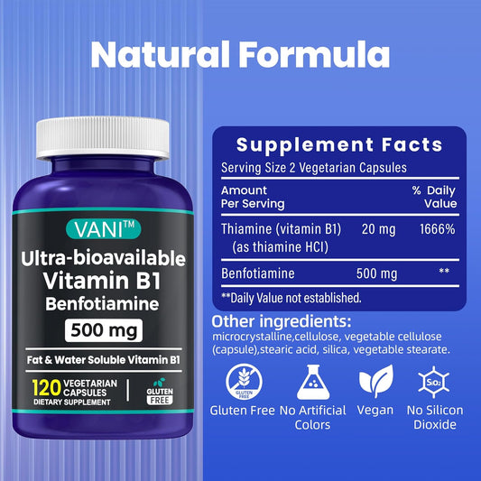 VANI 2 in 1 Enhanced Formula: Vitamin B1 with Benfotiamine 500mg - Fat Soluble Supplement - 120 Capsules