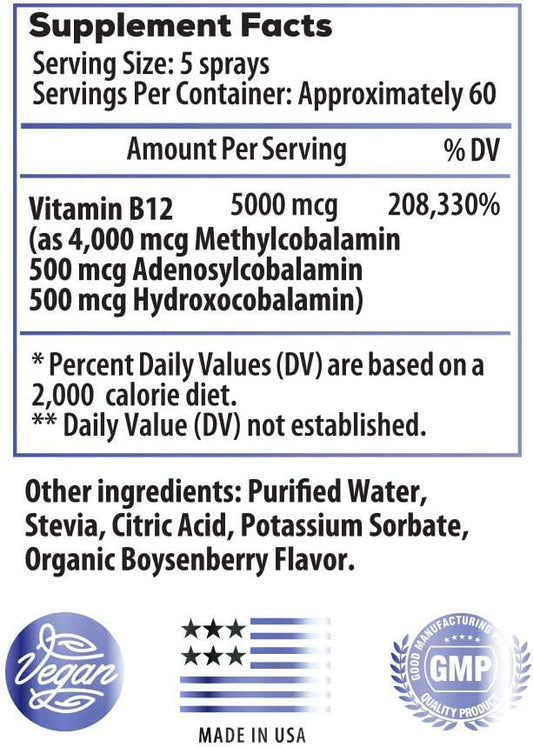 Organic Boysenberry Triple Vitamin B12 Liquid Spray: Nerve Health and Energy Booster - 5000 mcg Methylcobalamin, Adenosylcobalamin, Hydroxocobalamin - Keto, Sugar Free
