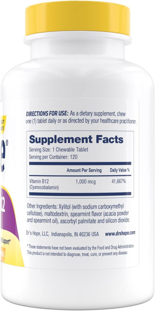 Vitamin B12 1000 Mcg Chewable Tablets for Metabolism, Energy, and Nervous System Support - Non-GMO & Gluten Free - 120 Tablets