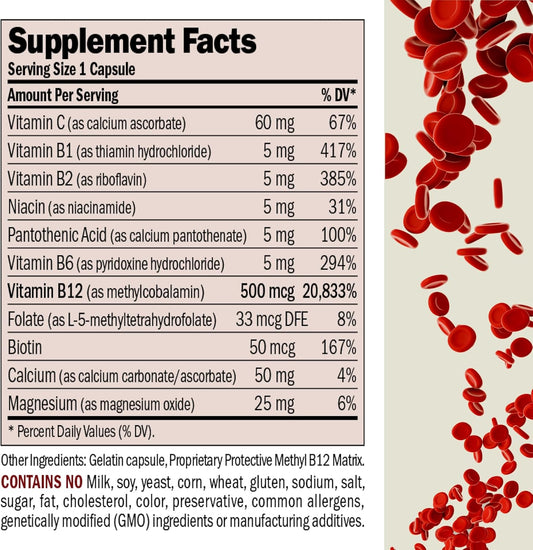 Vitamin B12 500 Capsules - Absorption-Protected Methylcobalamin, Energy & Stress Support, B-Complex, Easy-to-Swallow
