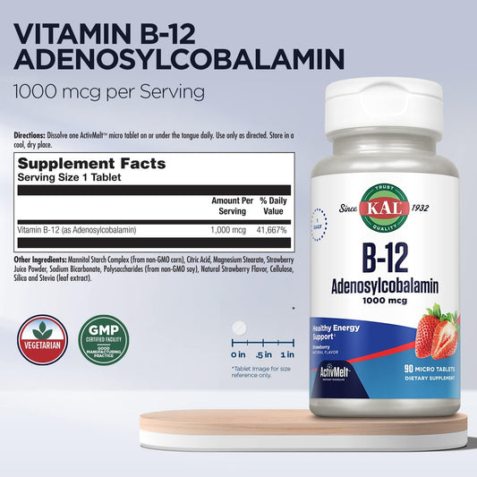 High Absorption Vitamin B12 1000 mcg ActivMelt Tablets for Energy, Metabolism, Nerve & Red Blood Cell Support - 90 Servings