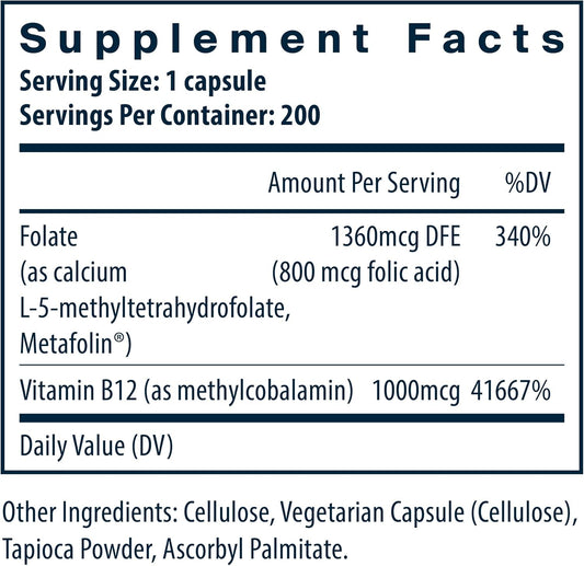 High-Potency Vegan Vitamin B12 & Methylated Folate Supplement for Nervous System and Metabolism Support - 200 Capsules
