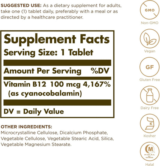 SOLGAR Vitamin B12 100 mcg Tablets - Supports Energy Metabolism & Nervous System - Non-GMO, Vegan, Gluten-Free - 100 Servings