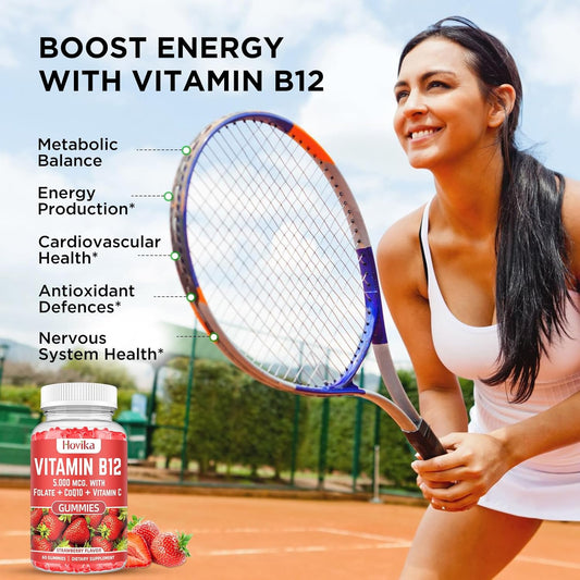 High Absorption Vitamin B12 Complex Energy Gummies with CoQ10, Folate, Vitamin C - 60 Count Chewable B12 for Energy Support & Bone Health