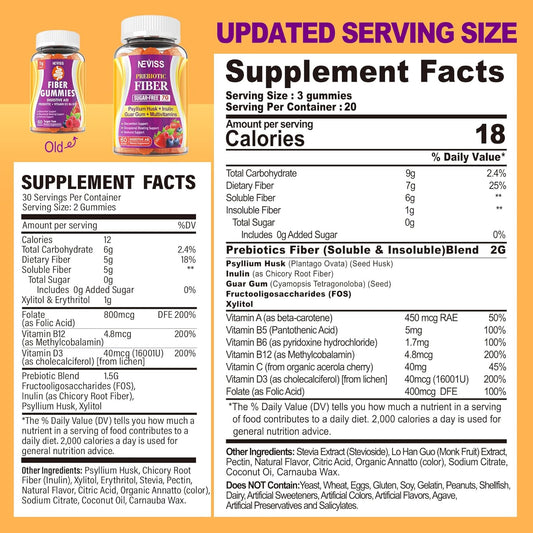 NEVISS Sugar Free Psyllium Husk Prebiotic Fiber Gummies with Multivitamins - High Fiber & Prebiotic Blend with Vitamin B12, D3, Folate, C