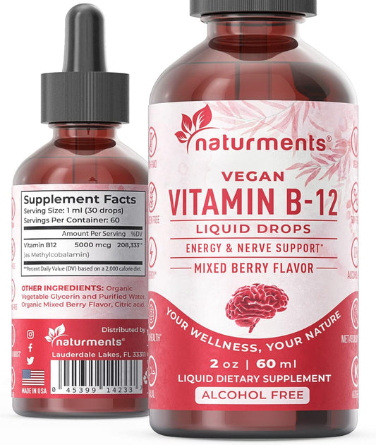 Organic Liquid Vitamin B12 Drops for Energy & Nerve Support - 5000 mcg, Vegan, Non-GMO, Alcohol and Sugar Free - 2 Fl Oz