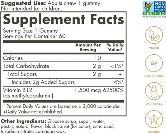 Vegan Methyl B12 Vitamin Gummies for Energy & Nerve Function - Gluten-Free & Dairy-Free - 60 Gummies 1500 mcg