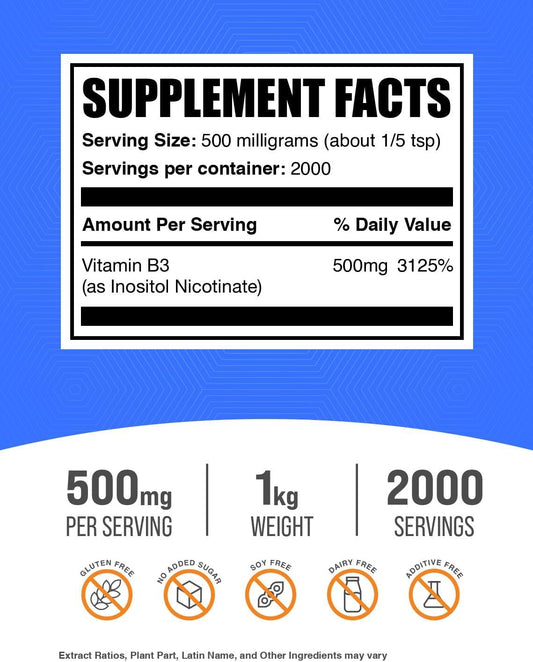 BulkSupplements.com Flush Free Niacin Powder 500mg – Inositol Hexanicotinate Vitamin B3 Supplement, Gluten Free, 1kg (2.2 lbs) Pack of 1
