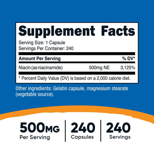 Nutricost Niacinamide 500mg Capsules - Non-GMO, Gluten Free, Flush Free Vitamin B3 Supplement with 240 Capsules