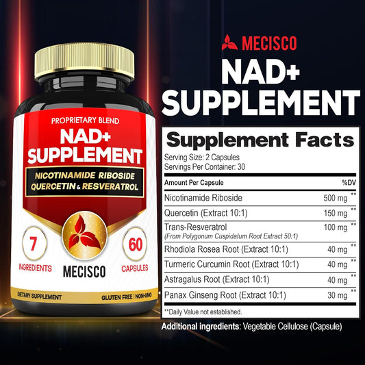NAD+ Supplement with Nicotinamide Riboside, Resveratrol, and Quercetin for Energy and Focus - 80 Capsules