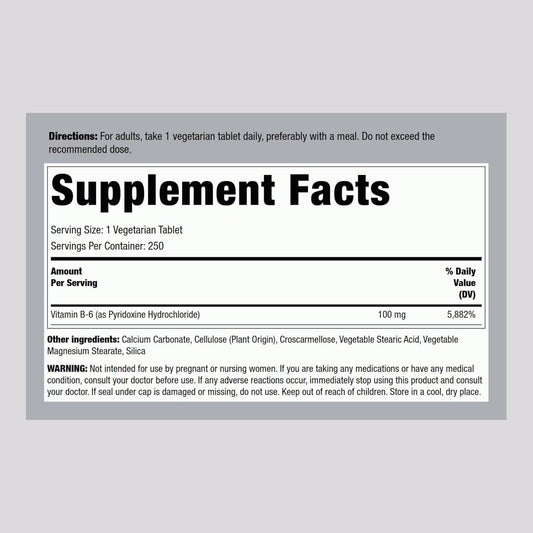 Vitamin B-6 100mg Supplement Tablets | 250 Count | Pyridoxine Hydrochloride | Non-GMO & Vegetarian