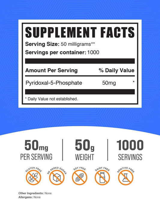 P-5-P Vitamin B6 Powder Supplement - 50mg per Serving, Gluten Free - 50g (1.8 oz) Pack of 1